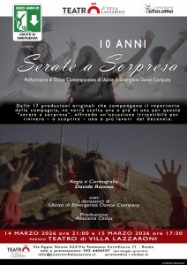 In occasione dei suoi dieci anni di attività, “Uscite di Emergenza Dance Company” celebra il proprio percorso con una serata unica e imprevedibile, tipica del suo stile. Il pubblico non saprà quale spettacolo andrà in scena fino all’inizio della performance. Dieci anni – Una serata a sorpresa rappresenta un atto di fiducia reciproca tra compagnia e pubblico, invitando gli spettatori a vivere l’esperienza teatrale nell’autenticità del momento presente. È una celebrazione del legame costruito in dieci anni di attività, attraverso il tempo condiviso sul palco e in platea, in un dialogo vivo che si rinnova ad ogni incontro. L’evento è pensato non solo per il pubblico affezionato, ma anche per chi si avvicina per la prima volta a “Uscite di Emergenza Dance Company”, offrendo un’occasione unica per scoprire il repertorio della Compagnia.
